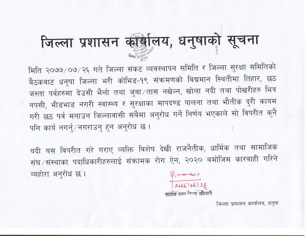 कोरोना संक्रमणको विद्यमान अवस्थालाई मध्यनजर गर्दै जिल्ला संकट व्यवस्थापन समिति र जिल्ला सुरक्षा समितिको बैठकबाट दीपावली र छठ पर्वमा देउसी भैलो तथा जुवातास नखेल्न, खोला नदी तथा पोखरीहरु भित्र नपसी, भिडभाड नगरी स्वास्थ्य सुरक्षाका मापदण्ड पालना तथा भौतिक दूरी कायम गरी छ्ठ पर्व मनाउन जिल्लावासीसँग आग्रह गरिएको छ । जिल्ला प्रशासन कार्यालय धनुषाले खोला, नदी तथा पोखरीहरु भित्र नपसी छठ पर्व मनाउन आग्रह गरेको छ । प्रशासनले दीपावली तथा छठ पर्वमा देउसी भैलो तथा जुवातास खेल्नमा समेत रोक लगाएको छ ।