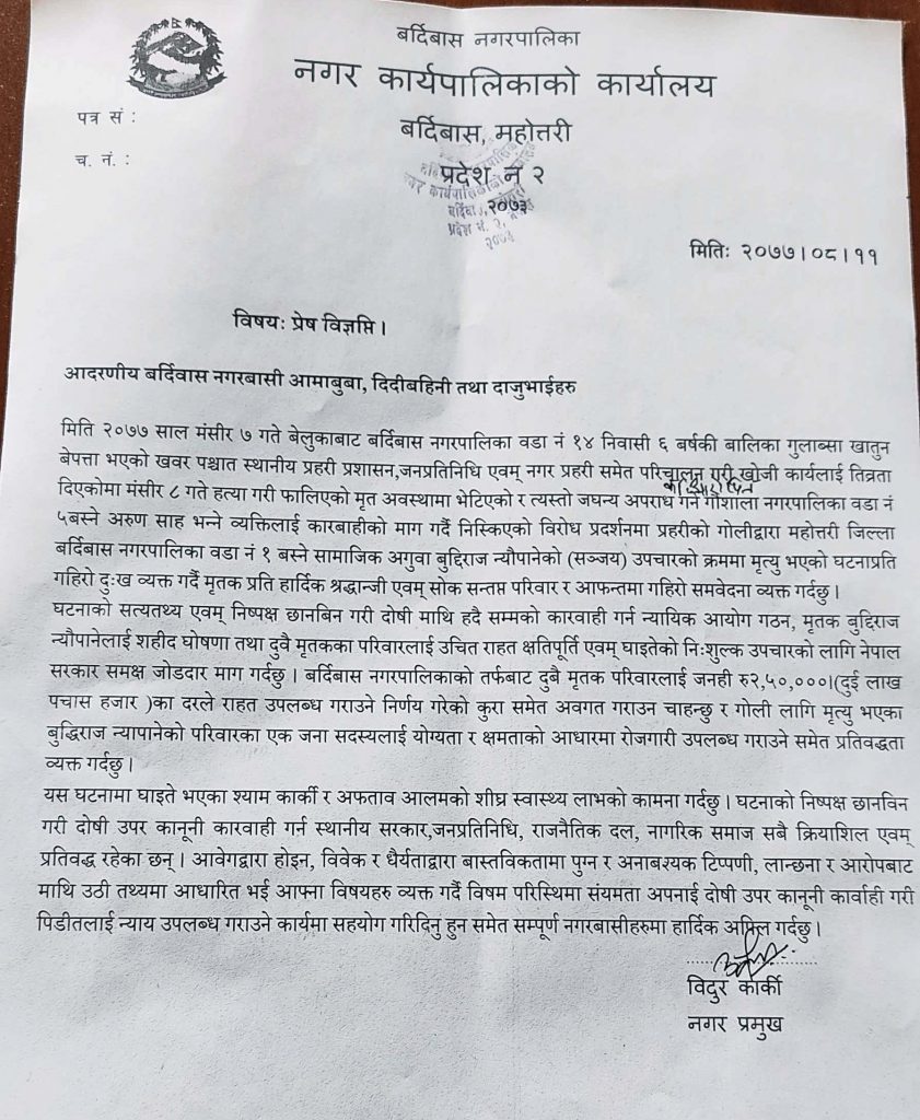 गएको सोमबार राति बर्दिबास नगरपालिका १४ का शुभम् बस्तीका सहिद आलमकी ६ वर्षीया छोरी गुलाबशा खातुनको बलात्कार पश्चात हत्या भएको अवस्थामा बोरामा शव भेटिएको थियो भने बालिकाको सो घटना विरुद्ध मंगलबार दिउँसो प्रदर्शनमा उत्रेका बेला प्रहरीले चलाएको गोली लागेर बर्दिबास नगरपालिका १ का ४३ वर्षीय संजय भनिने बुद्धिराज न्यौपानेको मृत्यु भएको थियो ।