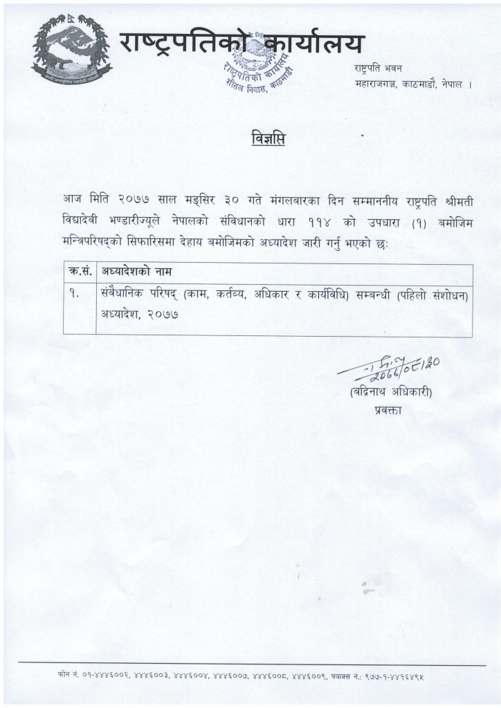 संवैधानिक परिषदबारे सरकारको अध्यादेशलाई राष्ट्रपति विद्यादेवी भण्डारीले जारी गर्नुभएको छ । नेपालको संविधानको धारा ११४ को उपधारा १ बमोजिम राष्ट्रपति भण्डारीले संवैधानिक परिषद् (काम, कर्तव्य र अधिकार) सम्बन्धी (पहिला संशाेधन) अध्यादेश २०७७ जारी गर्नुभएको हो ।