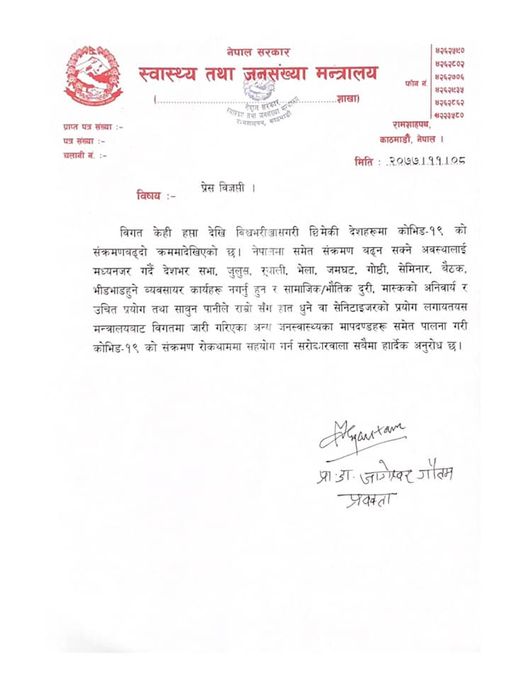 ‘विगत केही सातादेखि छिमेकी देश भारतलगायत विश्वभर कोभिड १९ को संक्रमण दर बढ्दो देखिएको छ’, मन्त्रालयद्वारा जारी विज्ञप्तिमा भनिएको छ, ‘नेपालमा समेत संक्रमण बढ्न सक्ने अवस्थालाई मध्यनजर गर्दै देशभर सभा, सम्मेलन, जुलुस, र्याली, भेला, जमघट, सेमिनार तथा भीडभाड हुने व्यवसायका कार्यहरु नगर्न अनुरोध छ ।’