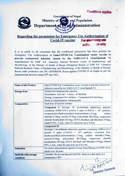 औषधि व्यवस्था विभागले रुसी खोप स्पुतनिक भी लाई नेपालमा आपत्कालीन प्रयोगको अनुमति दिने निर्णय गरेको हो । नेपालमा यसअघि भारतको कोभिशिल्ड र चीनको भेरोसेल खोपले आपत्कालीन प्रयोगको अनुमति पाएर अहिले त्यसको प्रयोग भइरहेको छ ।
