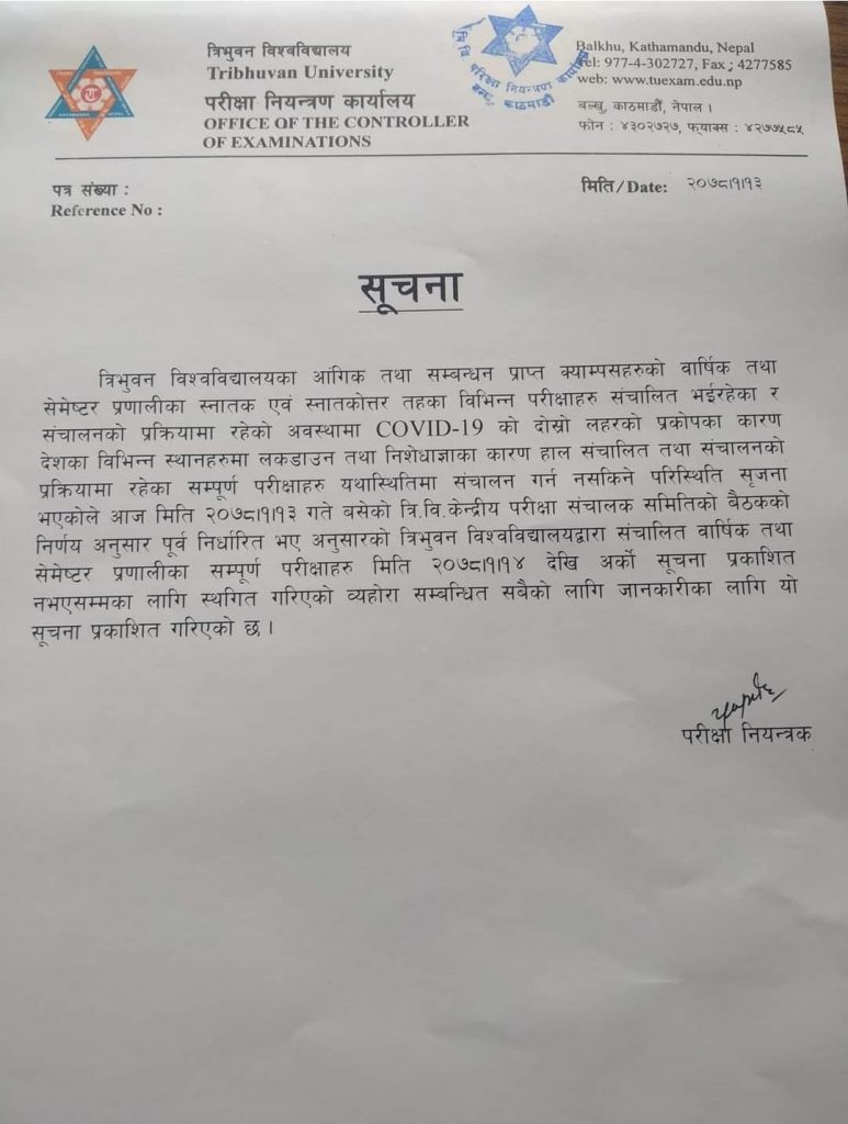 कोरोना महामारीको दोस्रो लहरका कारण विभिन्न स्थानमा लकडाउन र निषेधाज्ञा जारी भएको बताउँदै केन्द्रीय परीक्षा सञ्चालक समितिको बैठकले वार्षिक तथा सेमेस्टर प्रणालीका सम्पूर्ण परीक्षाहरु वैशाख १४ गतेदेखि अर्को सूचना प्रकाशित नभएसम्मका लागि स्थगित गरेको हो ।