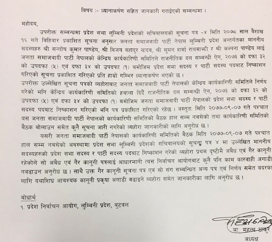 प्रदेशसभा सचिवालयले निकालेको सूचनामा भने जसपा केन्द्रीय कार्यकारिणी समितिले राजनीतिक दलसम्बन्धी ऐन २०७३ को दफा ३२ को उपदफा (५) बमोजिम प्रदेशसभा सदस्य र पार्टी सदस्यबाट निष्कासन गरेको सूचना जसपा लुम्बिनी प्रदेश संसदीय दलले दिएको उल्लेख गरिएको छ । तर जसपाका दुईमध्ये एक अध्यक्ष ठाकुरले कार्यकारिणी समितिको बैठक नै नबोलाइएको भन्दै निर्वाचन आयोगको ध्यानाकर्षण गराएका हुन् ।