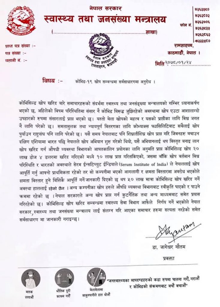 स्वास्थ्य तथा जनसंख्या मन्त्रालयले भारतको सेराम इन्स्टिच्युटसँग ५० लाख खोप खरिद हाललाई सम्भव नभएको जनाएको छ ।