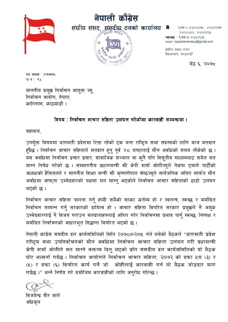 काठमाण्डाै – प्रमुख प्रतिपक्षी दल नेपाली कांग्रेसले प्रधानमन्त्री केपी शर्मा ओली र शिक्षामन्त्री कृष्णगोपाल श्रेष्ठलाई कारबाहीको माग गर्दै निर्वाचन आयोगमा उजुरी दिएको छ । कांग्रेस संसदीय दलले निर्वाचन आयोगमा आज उजुरी दर्ता गराएको हो । आचारसंहिता विपरीत सरकार प्रमुखले नै उम्मेदवारलाई नै विजय गराउन मतदातालाई अपिल गरेर चुनावमा प्रभाव पार्नु स्वच्छ, निष्पक्ष र मर्यादित चुनावको आधारभूत सिद्धान्त विपरीत भएको उजुरीमा भनिएको छ ।
