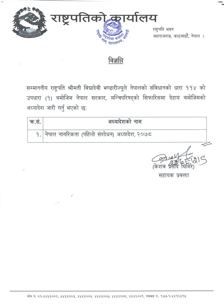 राष्ट्रपति विद्यादेवी भण्डारीले नागरिकतासम्बन्धी अध्यादेश जारी गरेकी छिन् ।