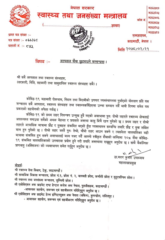 मन्त्रालयले आफ्नो स्वीकृत शैयाको कम्तिमा २० प्रतिशत शैया कोभिड–१९ संक्रमित बालबालिहरुको उपचारमा प्रयोग हुने गरी तयारी अवस्थामा राख्न अनुरोध गरेको हो । महाशाखा प्रमुख डा. मदनकुमार उपाध्यायले जारी गरेको विज्ञप्तिमा भनिएको छ । ‘प्रथम लहर र दोस्रो लहर अत्याधिक मात्रामा प्रौढ र युवाहरु संक्रमित भएको हुँदा व्यवस्थापन सम्बन्धी तयारी प्रौढ र युवा लक्षित मात्र हुन पुगेको छ । दोस्रो लहर जस्तै पुनः तेस्रो, चौथो लहर आउन सक्ने र त्यसबेला बालबालिका बढी मात्रामा संक्रमित हुन सक्ने अवस्थालाई मध्य नजर गर्दै आफ्नो स्वीकृति शैयाको कम्तिमा कम्तिमा २० प्रतिशत शैया कोभिड–१९ संक्रमित बालबालिहरुको उपचारमा प्रयोग हुने गरी तयारी अवस्थामा राख्न अनुरोध छ । साथै वैकल्पिक अक्सिजनको व्यवस्थापन समेत गर्नुहुन अनुरोध छ ।’