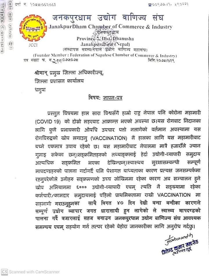 जनकपुरधाम उद्योग बाणिज्य संघले व्यवसाय खोल्न दिन र व्यवासयीलाई कोरोनाविरुद्धको खोप लगाइदिन स्थानीय प्रशासनसँग माग गरेको छ ।