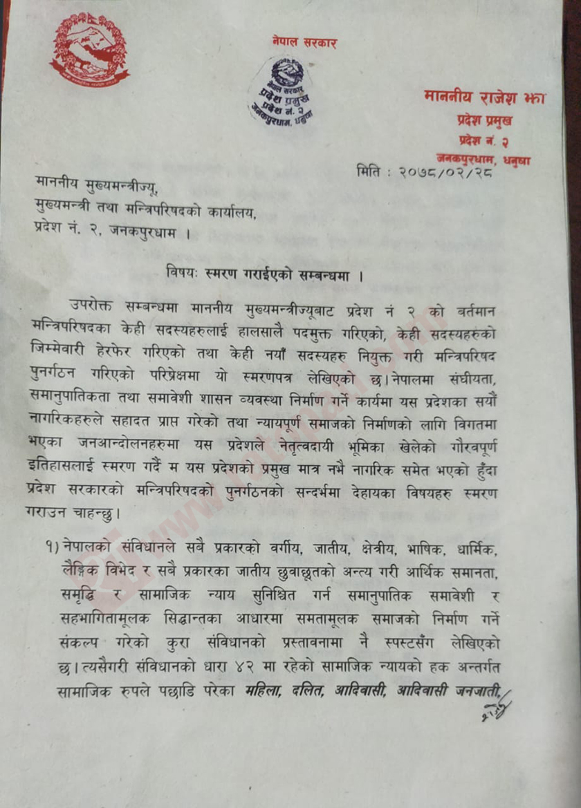 ‘प्रदेश २ मा मूलतः मधेसी समुदायका नागरिकको वसोबास रहेको भएता पनि गैर मधेसी पहाडी मूलका नागरिकहरुको पनि उल्लेख्य बसोबास रहेकोछ,’ प्रदेश प्रमुखको पत्रमा भनिएको छ,‘… प्रदेशको मन्त्रिपरिषदमा उल्लेखित जाति समुदाय र वर्गको अनुहार प्रतिविम्वित हुनुपर्छ भन्ने कुरामा द्विविधा हुन सक्दैन ।’