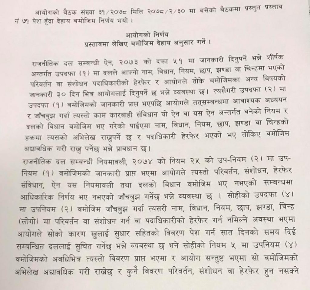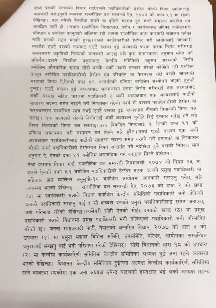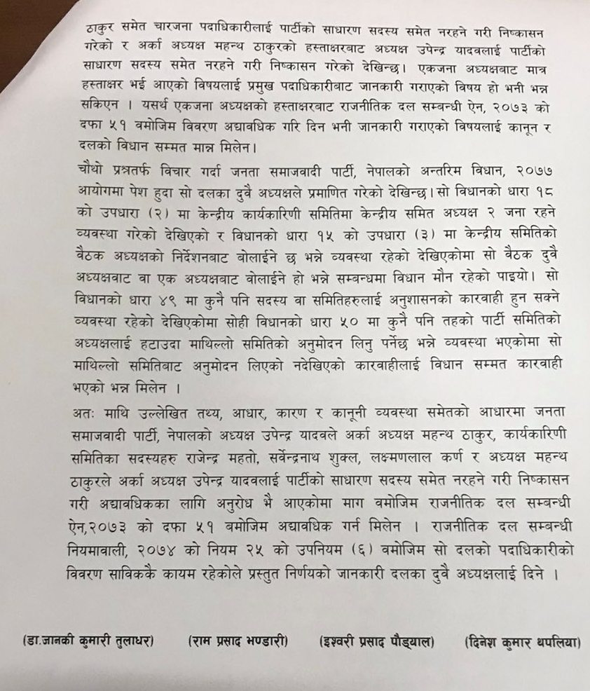 प्रमुख निर्वाचन आयुक्त दिनेश कुमार थपलिया र आयुक्तहरु जानकी कुमारी तुलाधर, रामप्रसाद भण्डारी र ईश्वरी प्रसाद पौड्यालको संयुक्त निर्णयका रुपमा निर्वाचन आयोगले जसपाका दुबै पक्षको निवेदनलाई खारेज गरिदिएको हो ।