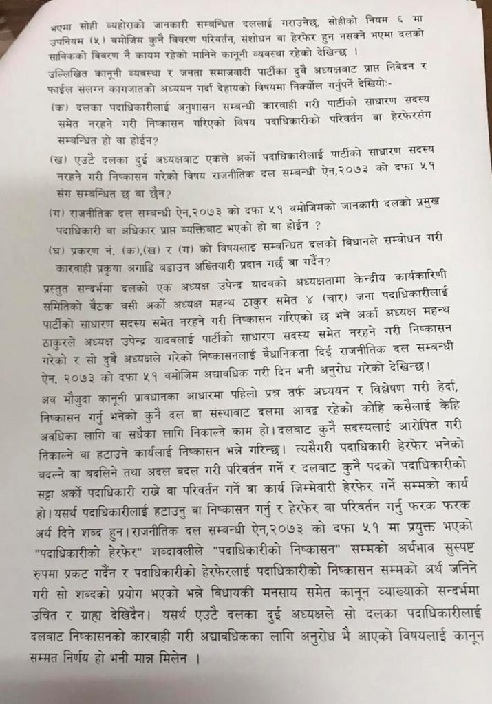 निर्वाचन आयोगले महन्थ ठाकुर र उपेन्द्र यादव दुबै पक्षले गरेको कारवाहीलाई कानूनसम्मत नदेखिएको भन्दै दुई अध्यक्ष रहने गरी पुरानै पदाधिकारीहरु कायम रहने फैसला सुनाएको छ ।