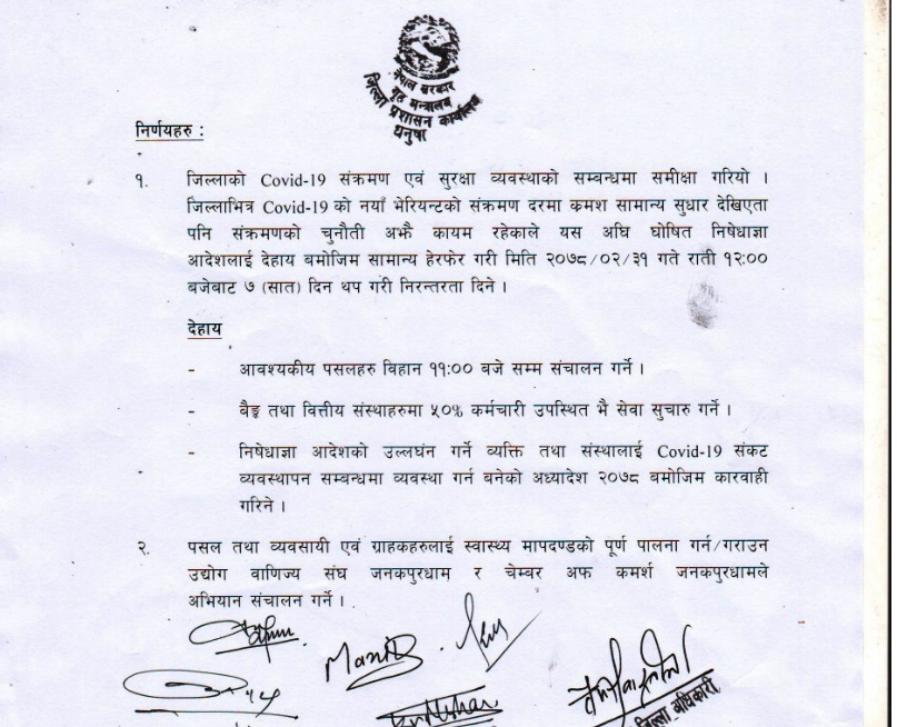 धुनषामा निषेधाज्ञा फेरि ७ दिन थप गरिएको छ ।