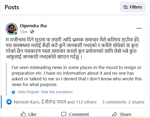 प्रदेश नम्बर २ का मुख्य न्यायाधिवक्ता दिपेन्द्र झाले आफ्नो राजीनामाको विषयमा कसैले अफवाह फैलाइएको प्रति गम्भीर आपत्ति जनाएका छन् ।