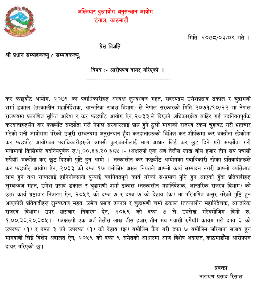 आयोगले एक अर्ब ३३ लाख २० हजार ३८५ रुपैयाँ विगोसहितको भ्रष्टाचार मुद्दा बुधबार दायर गरेको हो । आयोगका प्रवक्ता नारायणप्रसाद रिसालका अनुसार कर फर्छ्यौट आयोगको अध्यक्षका रुपमा लुम्बध्वज महत तथा सदस्यद्वय उमेशप्रसाद ढकाल र चुडामणि शर्मा ढकालले अधिकार क्षेत्रभन्दा बाहिर गइ करदातासँग कर फर्छ्यौट सम्झौता गरी राजस्व रकम चुहावट गरेको सम्बन्धमा मुद्दा दायर गरिएको हो । उनीहरुले एक अर्ब ३३ लाख २० हजार ३८५ रुपैयाँ वक्यौता कर छुट दिएको पुष्टि भएपछि उनीहरुविरुद्ध मुद्दा दायर गरिएको आयोगले जनाएको छ ।