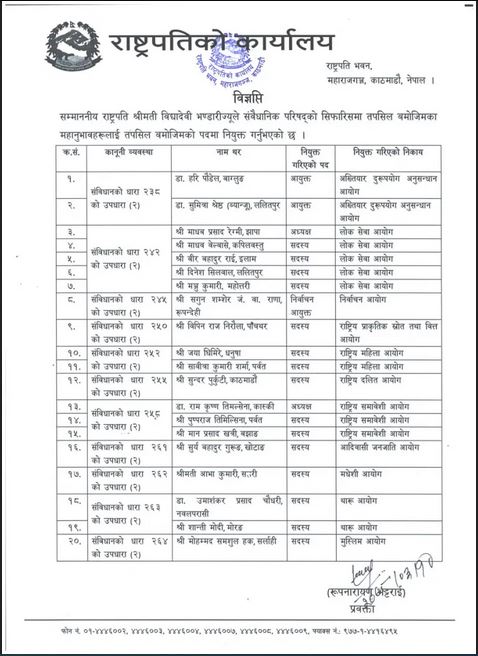 संवैधानिक परिषद्ले वैशाख अन्तिम साता सिफारिस गरेका २० पदाधिकारीलाई संसदीय सुनुवाइ विना नै नियुक्त गरिएको हो । गत वैशाख २६ गते बसेको संवैधानिक परिषदको बैठकले लोकसेवा आयोग, अख्तियार दुरुपयोग अनुसन्धान आयोगलगायतका संवैधानिक आयोगमा २० पदाधिकारी सिफारिस गरेको थियो । संवैधानिक परिषदले सिफारिस गरेपछि उनीहरुको संसदीय सुनुवाइ हुने र सुनुवाइ समितिको अनुमोदनपछि राष्ट्रपतिले नियुक्त गर्ने संवैधानिक व्यवस्था छ ।