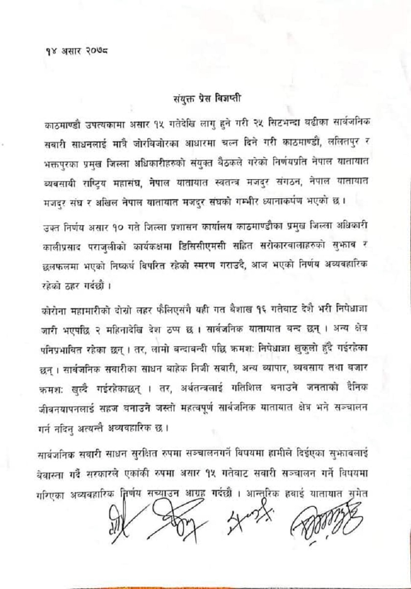 यातायात व्यवसायी र मजदुर संघ–संगठनका प्रतिनिधिहरुले असार १५ गतेबाट सार्वजनिक सवारी साधन सञ्चालन गर्ने सरकारको निर्णय एकांकी भएको भन्दै सच्याउन आग्रह गरेका छन् ।