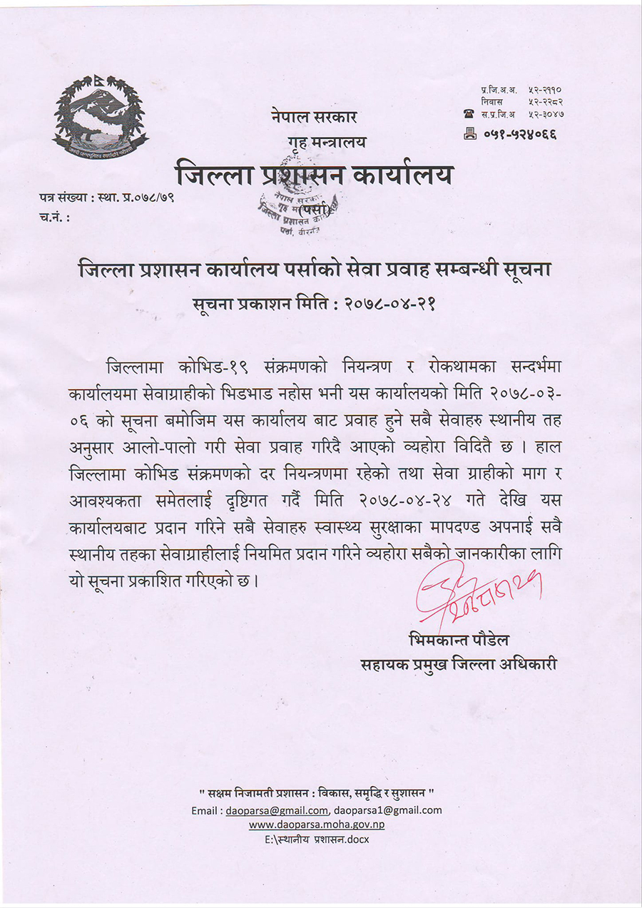 जिल्ला प्रशासन कार्यालयले बिहीबार सूचना जारी गर्दै साउन २४ गतेदेखि कार्यालयबाट प्रदान गर्दै आएका सबै सेवाहरु स्वास्थ्य सुरक्षा मापदण्ड अपनाइए सबै स्थानीय तहका सेवाग्राहीलाई नियमित प्रदान गर्ने जनाएको छ । कोरोना संक्रमण रोकथाम तथा नियन्त्रणका लागि पर्सामा वैशाख १६ गतेदेखि निषेधाज्ञा जारी गरिएको थियो । निषेधाज्ञाको समयमा जिल्ला प्रशासन कार्यालय लगायत सबै सरकारी कार्यालयले अत्यावश्यक सेवा बाहेकका सेवा बन्द गरेका थिए । असार ७ गतेदेखि भने प्रशासन लगायत अन्य सरकारी कार्यालयले पालिका अनुसार आलोपालो सेवा प्रवाह गर्दै आएका थिए ।