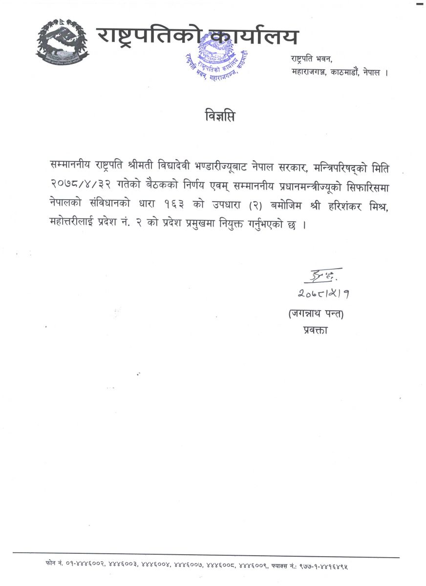 मंगलबार प्रधानमन्त्री शेरबहादुर देउवाको सिफारिसमा राष्ट्रपति विद्यादेवी भण्डारीले महोत्तरी स्थायी घर भएका मिश्रलाई नियुक्त गरेकी हुन् । उनलाई संविधानको धारा १६३ को उपधारा (२) बमोजिम प्रदेश प्रमुख नियुक्त गरिएको राष्ट्रपतिको कार्यालयले जनाएको छ । राष्ट्रपति भण्डारीले आजै राजेश झालाई प्रदेश २ को प्रदेश प्रमुखबाट पदमुक्त गरकी थिइन् ।