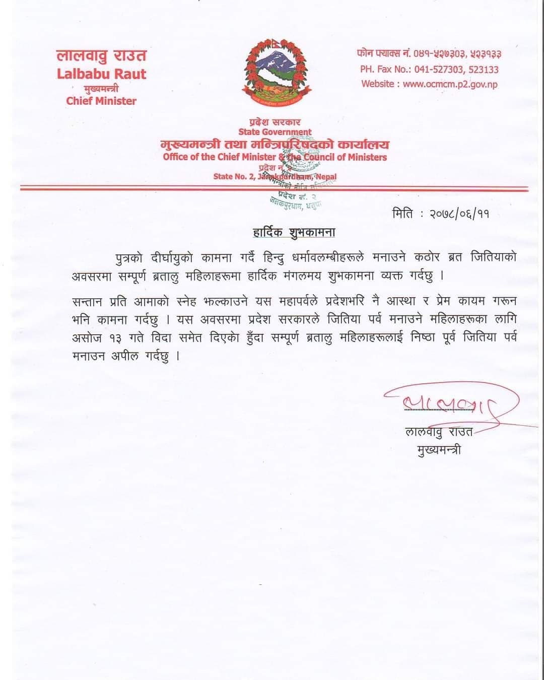 मधेसका महिलाहरुको ठूलो पर्व जितियाको अवसर पारेर महिलाहरुलाई सार्वजनिक विदा दिएको हो । मुख्यमन्त्री लालबाबु राउतले सोमबार जितिया पर्वको शुभकामना दिँदै असोज १३ गते महिलाहरुलाई सार्वजनिक विदा दिने बताएका हुन् । सन्तानप्रति आमाको स्नेह झल्काउने यस पर्वले प्रदेशभरि नै आस्था र प्रेम कायम गरोस् भनी मुख्यमन्त्रीले शुभकामना दिएका छन् ।