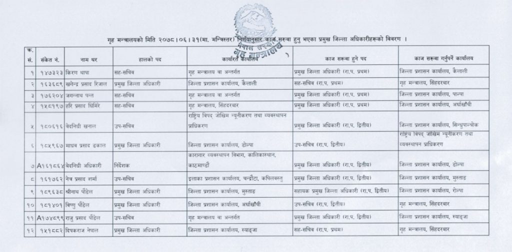 यसैगरी गृह मन्त्रालयका सहसचिव हरिप्रसाद घिमिरेलाई अर्घाखाँची सरुवा गरिएको छ । अर्घाखाँचीका प्रजिअ विष्णु पौडेललाई गृह मन्त्रालयमा तानिएको छ ।