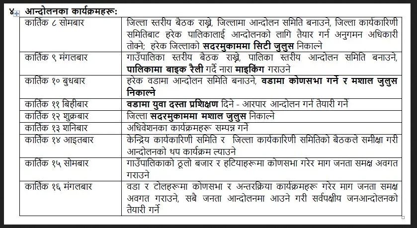 त्यसैगरि कार्तिक १० गते बुधवार हरेक वाडमा आन्दोलन समिति वनाउने,वडामा कोणसभा गर्ने र मशाल जुलुस निकाल्ने कार्यक्रम तय गरेको छ भने कार्तिक ११ गते वडामा युवा दस्ता प्रशिक्षण दिएर आरापार आनदोलनको तयारी गर्ने भएको छ । कार्तिक १२ गते जिल्ला सदरमुकाममा मशाल जुलुस प्रर्दशन,कार्तिक १३ गते अधिवेशनका कार्यक्रम सम्पन्न गर्ने कार्यक्रम राखिएको जारी विज्ञप्ती माफर्त जनाइएको छ । त्यस्तै कािर्तक १४ गते केन्द्रिय कार्यकारीणी समिति र जिल्ला कार्यकारिणी समितिको वैठकले समीक्ष गरी आन्दोलनको थप कार्यक्रम ल्याउने तय गरेको छ ।