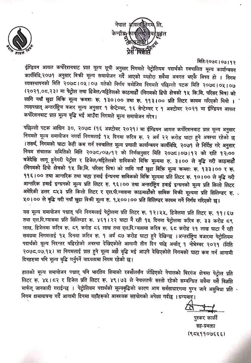 जसअनुसार अब पेट्रोलको खुद्रा बिक्री मूल्य प्रतिलिटर रु १३३, डिजेल–मट्टितेलको मूल्य प्रतिलिटर ११६ पुगेको छ भने खाना पकाउने ग्यासको प्रतिसिलिण्डर ५० रुपैयाँ मूल्य वृद्धि भएको छ । योसँगै खाना पकाउने एलपी ग्यासको मूल्य प्रतिसिलिण्डर १५ सय पुगेको निगमले जनाएको छ ।