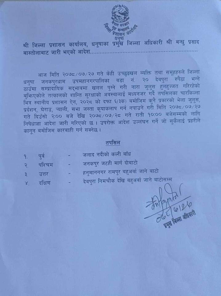 धनुषा जनकपुरधाम उपमहानगरपालिका वडा नं. २० देवपुरा रुपैठामा सम्प्रादायिक सद्भावमा खलल पुग्ने गरी नारा जुलुस हुलहुज्जत गरिरहेको बुझिएकोले तत्कालको शान्ति सुरक्षाको अवस्थालाई मध्यनजर गर्दै केही क्षेत्रमा निषेधाज्ञा जारी गरिएको छ । जिल्ला प्रशासन कार्यालय धनुषाले एक सुचना जारी गर्दै निषेधाज्ञा लागु गरिएको जानकारी दिएको छ ।