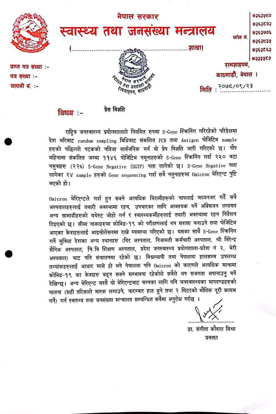पुस महिनामा संकलित कोरोना भाइरसका ११४६ पोजेटिभ नमुनाको स्क्रिनिङ गर्दा २५० वटामा एस जिन नेगेटिभ आएको थियो । एस जिन नेगेटिभ गरिएकामध्ये २४ वटामा जिन सिक्वेन्सिङ गरिएको र ती सबैमा ओमिक्रोनको संक्रमण पुष्टि भएको प्रवक्ता डा. संगीता मिश्राले जानकारी दिएकी छन् ।ओमिक्रोन भेरियन्टका कारण बढ्न सक्ने संक्रमितको चापलाई मध्यनजर गर्दै सबै अस्पताललाई तयारी अवस्थामा रहन भनिएको उनले बताइन् ।