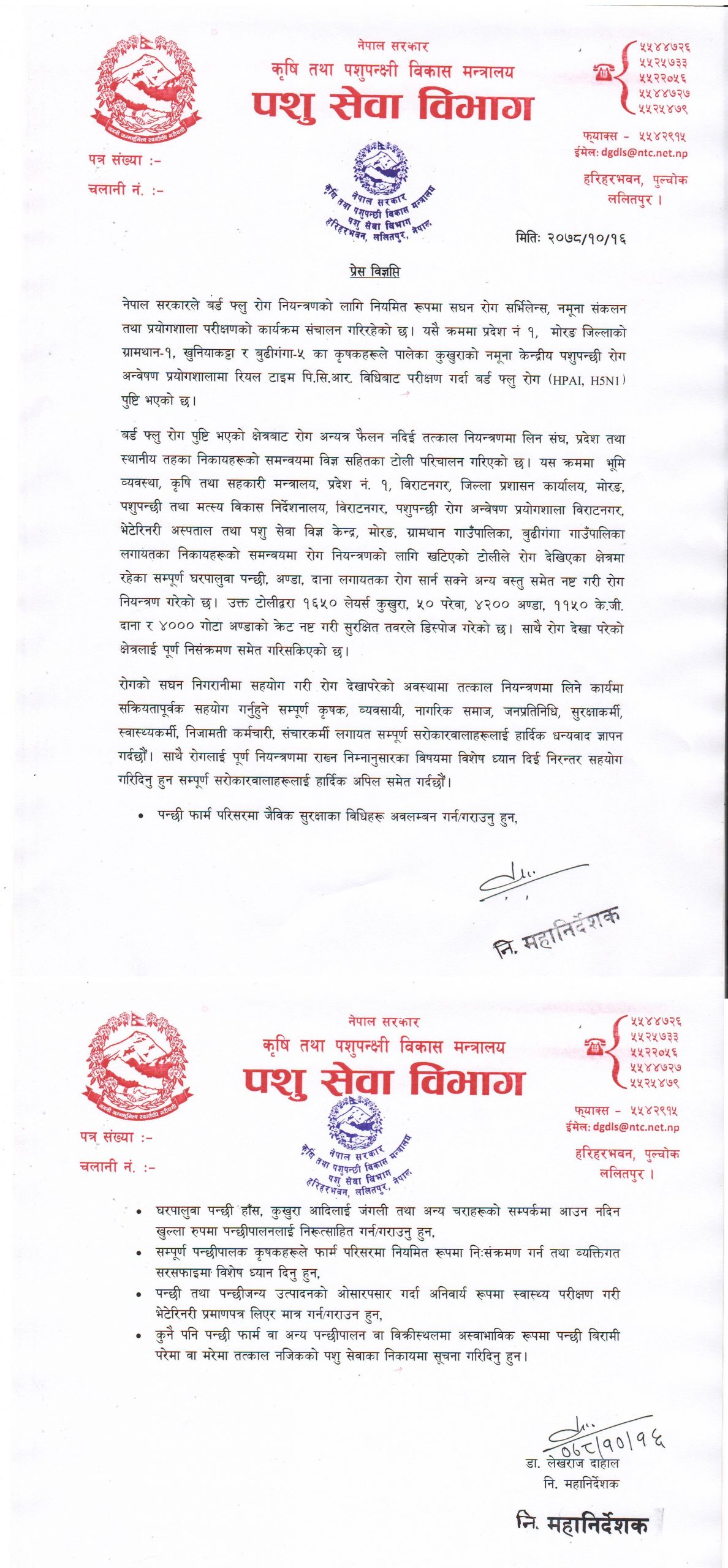 मोरङ जिल्लाको ग्रामथान-१ खुनियाकट्टा र बुढिगंगा -५ मा बर्डफ्लू देखिएको पशु सेवा विभागले पुष्टि गरेकाे हो । कुखुरामा फेला परेकाे बर्डफलू रोग (एच फाइभ एन वान, एच फाइभ एन वान) पुष्टि भएको पशु सेवा विभागले जनाएको छ। विभागले सोमबार एकविज्ञप्ति जारी गर्दै बर्डफ्लू नियन्त्रणका लागि नियमित रूपमा सघन रोग सर्भिलेन्स, नमुना संकलन तथा प्रयोगशाला परीक्षणको कार्यक्रम सञ्चालन भइरहेकाे जानकारी दिइएकाे छ ।