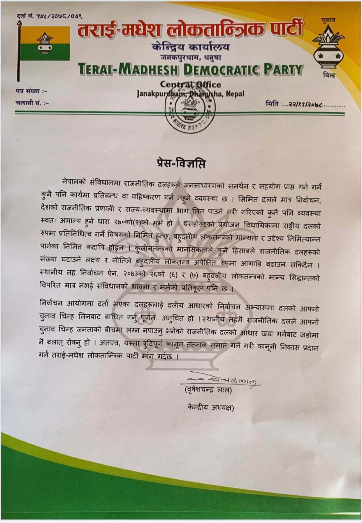 तराई–मधेश लोकतान्त्रिक पार्टीका अध्यक्ष वृषेशचन्द्र लालले दलीय आधारको निर्वाचन अभ्यासमा दलको आफ्नो चुनाव चिन्ह लिनबाट बाधिक गर्नु पूर्णतः अनुचित रहेको बताएका छन् ।
