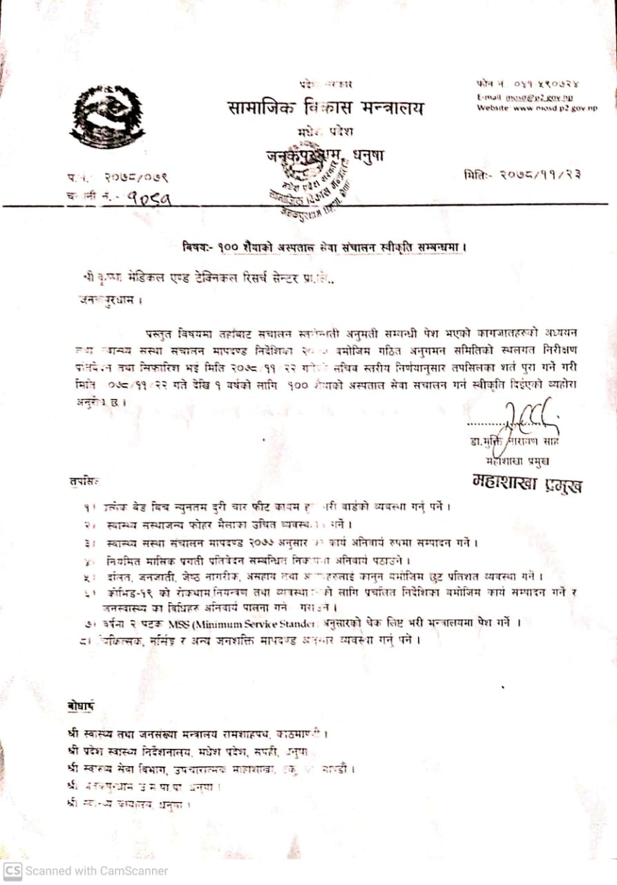 मधेश प्रदेश सरकारको सामाजिक विकास मन्त्रालयले गत फागुन २३ गते श्री कृष्णा मेडिकल एण्ड टेक्निकल रिसर्च सेन्टर प्रा.लि. जनकपुरधामलाई १ सय शैय्याको अस्पताल सञ्चालन गर्न स्वीकृति दिएको हो । मन्त्रालयका महाशाखा प्रमुख डा.मुक्तिनारायण साहले पत्रसंख्या २०७८/२०७९ चलानी नम्बर १० ९१बाट १ वर्षको लागि १ सय शैय्याको अस्पताल सेवा सञ्चालन गर्न स्वीकृति दिइएको उल्लेख छ । प्रदेश सरकारले स्वीकृति प्रदान गरेको अस्पताल जनकपुरधाम उपमहानगर पालिका र यसको वरिपरीको क्षेत्रमा कतै फेला परेको छैन् ।जनकपुर टुडे सञ्चारकर्मीको टोलीले अस्पताल खोजीमा पाँच दिन समय लगाउँदा पनि फेला पार्न सकेनन् । अस्पताल खोज्ने क्रममा महाशाखाका प्रमुख डा.मुक्तिनारायण साहसित सम्पर्क गर्दा उनले २/३ दिन पछि अस्पतालको विषयमा बताउने जानकारी दिए । ‘अस्पतालको विषयमा फोनमा संवाद गर्न कठिन छ’ उनले भने, भेंटेरै कुराकानी गर्दा समाधान निस्किन्छ ।डा.साहले पटक–पटक अस्पतालको विषयलाई ढाकछोप गर्ने प्रयासमात्र गरिरहे । डा.साहले जानकी मेडिकल कलेजको अस्पताल खरिद गरी सञ्चालन गर्न लागेको झूठो वयान दिए ।‘जानकी मेडिकल कलेजको सिटी अस्पताल खरिद गरिएको छ’डा.साहले भने, सिटी अस्पताल पास भइ नसके पनि बिक्रिनामाको कागजात बनाइएको आधारमा अस्पताल सञ्चालनको स्वीकृति दिएको हो ।तर असहज परि स्थिति सृजना भए अस्पतालको स्वीकृति रद्द गर्न सकिने उनले बताए ।