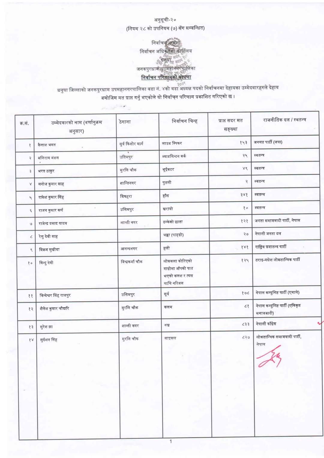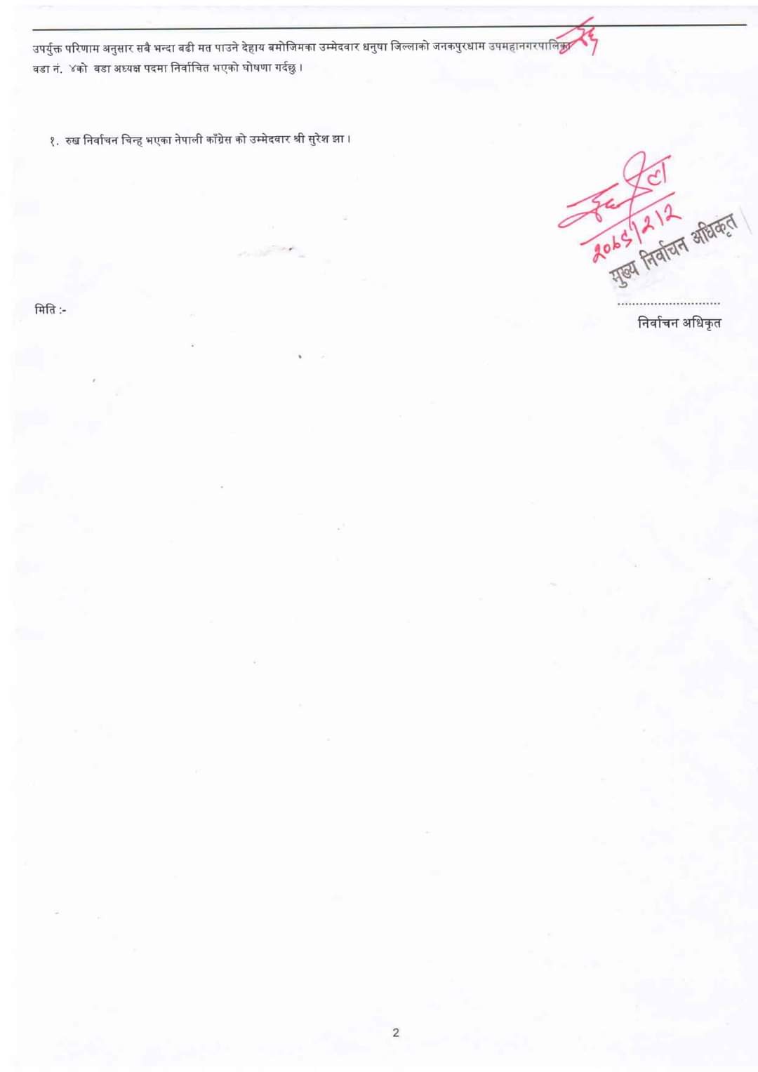 जनकपुरधाम उपमहानगरपालिका वडा नम्बर–४ को वडाध्यक्षमा नेपाली कांग्रेसका सुरेश झा पण्डित प्यानलसहित विजयी भएका छन् ।