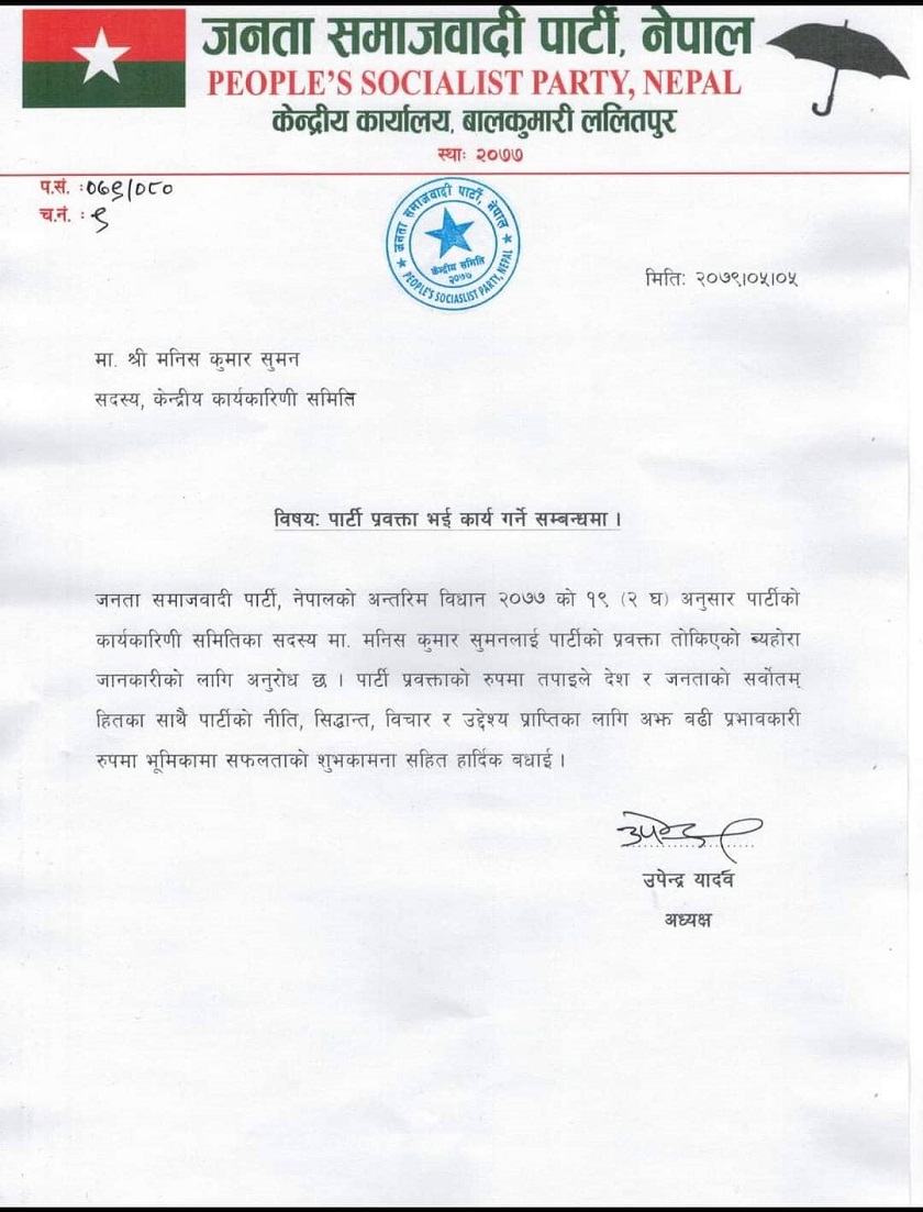 जनता समाजवादी पार्टी (जसपा), नेपालले मनिस कुमार सुमनलाई पार्टीको प्रवक्ता तोकेको छ ।