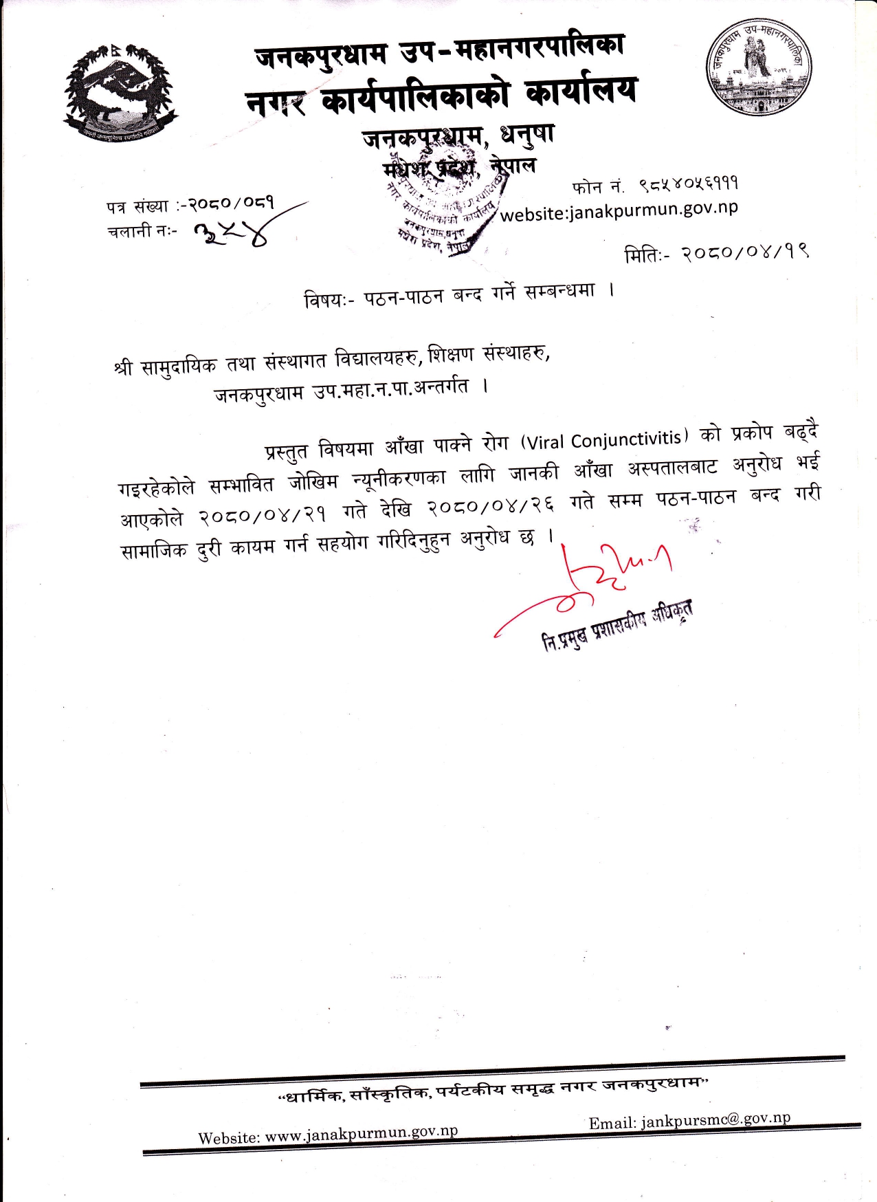 आँखा पाक्ने रोगको प्रकोप बढ्दै गएपछि जनकपुरधामको विद्यालयहरु एक साताको लागि बन्द गर्ने निर्णय गरिएको हो । आँखा पाक्ने रोगको सम्भावित जोखिम न्यूनीकरण गर्नका लागि आँखा अस्पतालबाट अनुरोध आएपछि साउन २१ गतेदेखि २६ गतेसम्म नगरभरिका सम्पूर्ण सामुदायिक तथा संस्थागत विद्यालयहरु, शिक्षण संस्थाहरु बन्द रह्ने जनाईएको छ ।