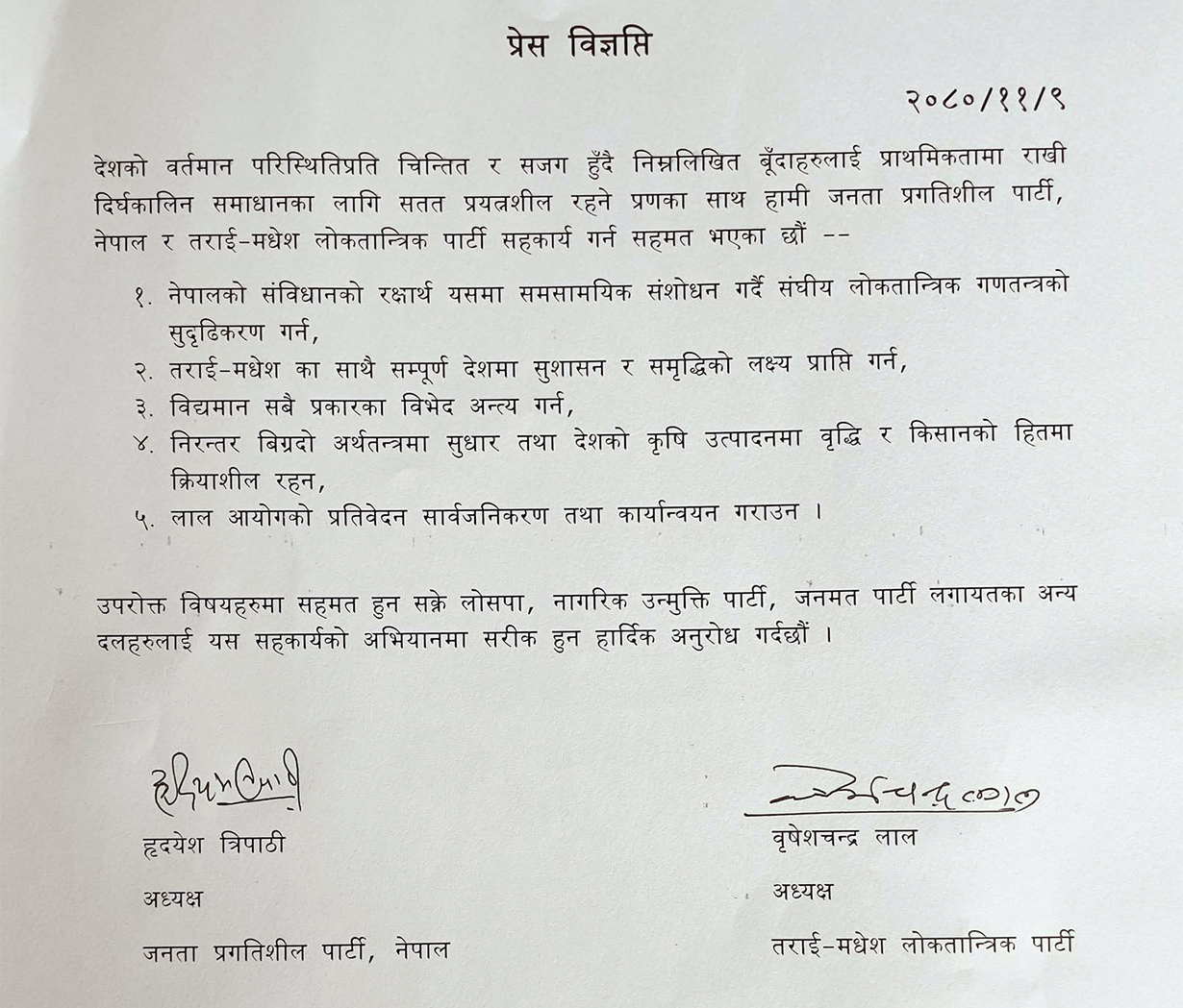 वृषेशचन्द्र लाल नेतृत्वको तराई–मधेश लोकतान्त्रिक पार्टी र हृदयेश त्रिपाठी नेतृत्वको जनता प्रगतिशिल पार्टी नेपालबीच कार्यगत एकता भएको छ । दुवै दलका अध्यक्षले आज पाँच बुँदे सहमति पत्रमा हस्ताक्षर गरेका छन् ।
