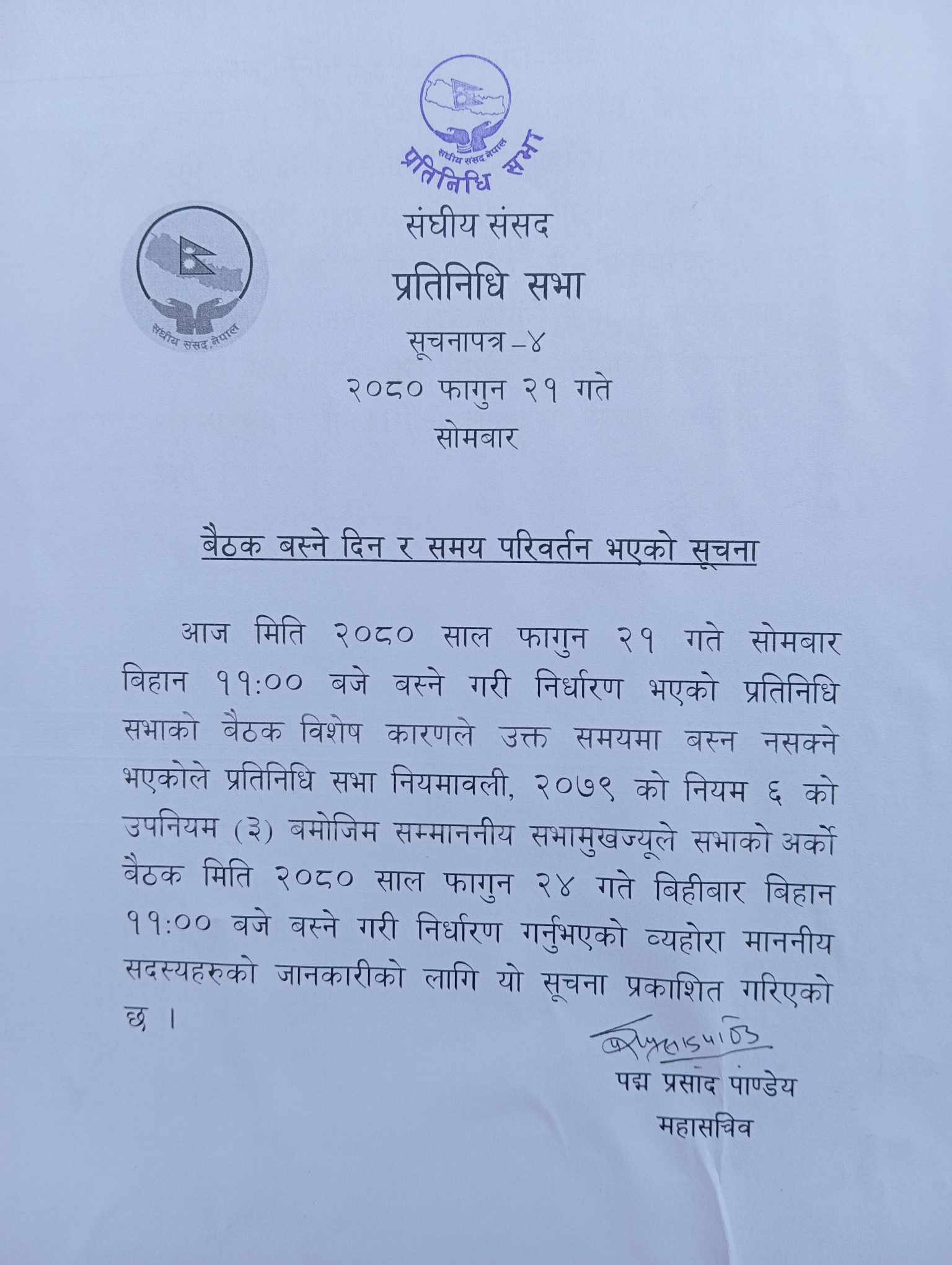 विशेष परिस्थितिका कारण प्रतिनिधि सभाको आजको बैठक फागुन २४ गते बिहीबार बिहान ११ बजेका लागि सूचना टाँसेर स्थगित गरिएको सचिवालयले जनाएको छ ।