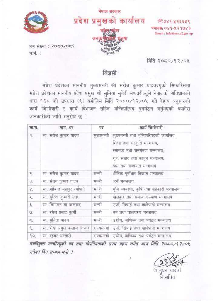 मुख्यमन्त्री सरोज कुमार यादवले मन्त्रिपरिषद् पुनर्गठन गरेर एमालेलाई सत्तामा प्रवेश गराएका हुन ।
