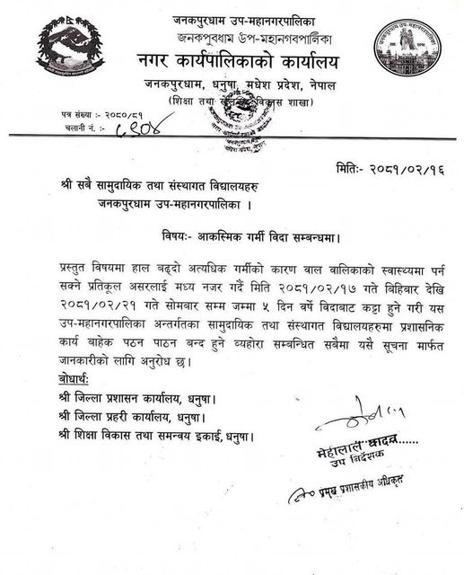 जनकपुरधाम उपमहानगरपालिकाले बुधबार एक सूचना जारी गर्दै उपमहानगरपालिकाभरिका सामुदायिक तथा संस्थागत विद्यालयहरुमा पाँच दिनसम्मका लागि आकस्मिक गर्मी विदा दिने निर्णय गरेको हो ।
