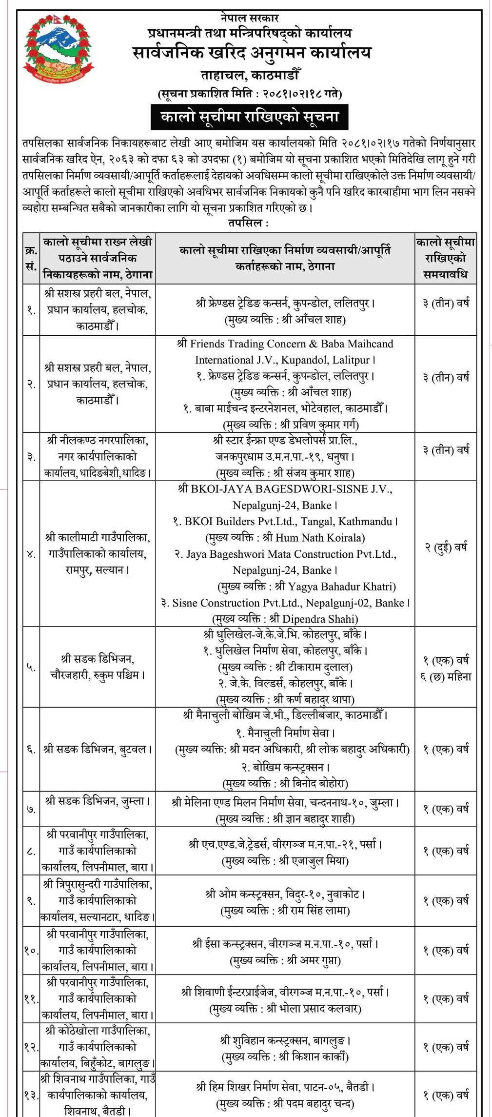 विभिन्न जिल्लाका निकायहरूले कालोसूचीमा राख्न लेखि पठाएका विभिन्न निर्माण कम्पनीहरूलाई कार्यालयले १ देखि ३ वर्षसम्मका लागि कालोसूचीमा राखेको हो।
