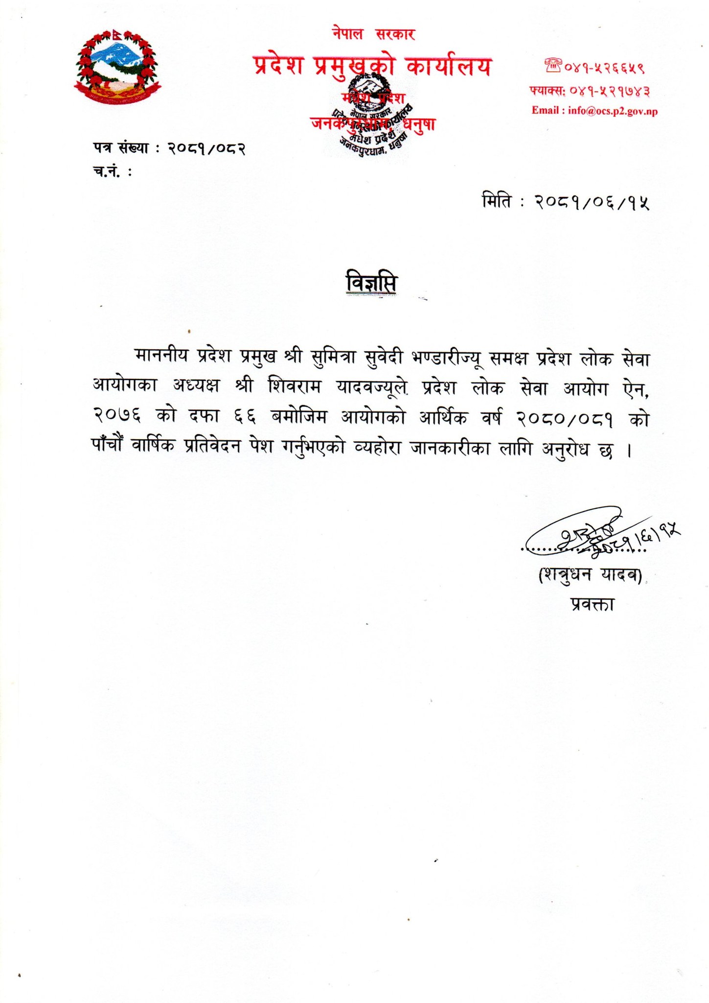 मधेश प्रदेश लोक सेवा आयोगका अध्यक्ष शिवराम यादवले प्रदेश प्रमुखको सचिवालयमा आयोजित विशेष कार्यक्रमबीच वार्षिक प्रतिवेदन पेश गर्नुभएको हो ।