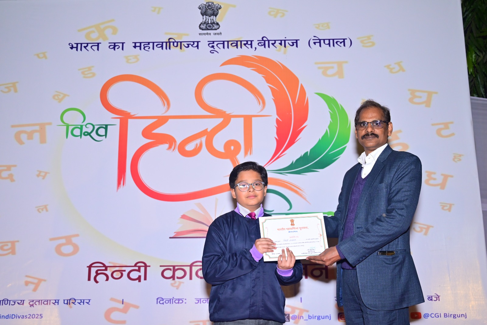 अंतर्राष्ट्रीय हिंदी दिवसको उपलक्षमा ७ जनवरी २०२५ का दिन आयोजना गरिएको हिंदी निबंध लेखन प्रतियोगिताका विजेता विद्यार्थीहरुलाई कार्यक्रममा पुरस्कृत गरिएको थियो । कार्यक्रममा भारतीय महावाणिज्य दुतावासका पदाधिकारी ,स्थानिय साहित्यकार,पत्रकार,समाजसेवी एवम जनप्रतिनिधिहरुको उल्लेख्य उपस्थिती रहेको थियो ।