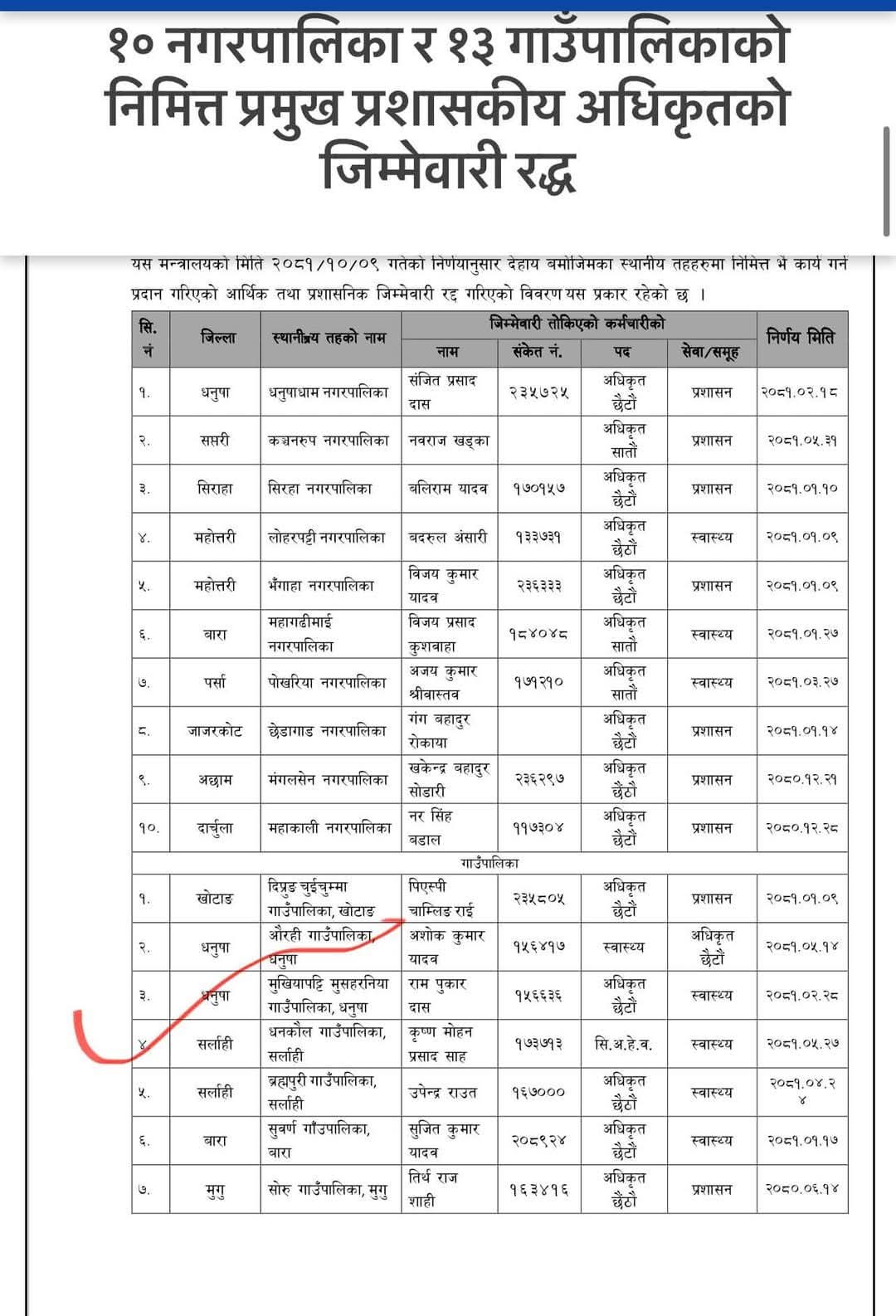 जिम्मेवारी रद्द गरिएका निमित्त प्रमुख प्रशासकीय अधिकृतहरूमा धनुषाको धनुषाधाम नगरपालिकाका संजित प्रसाद दास, औरही गाउँपालिकाका अशोक कुमार यादव, मुखियापट्टी मुसहरनिया गाउँपालिकाका रामपुकार दास, सप्तरीको कञ्चनरुप नगरपालिकाका नवराज खड्का, सिरहाको सिरहा नगरपालिकाका बलिराम यादव, महोत्तरीको लोहारपट्टी नगरपालिकाका बदरुल अंसारी, भंगहा नगरपालिकाका विजय कुमार यादव, बाराको महागढीमाई नगरपालिकाका विजय प्रसाद कुशवाहा, पर्साको पोखरिया नगरपालिकाका अजय कुमार श्रीवास्तव, जाजरकोटको छेडागाड नगरपालिकाका गंग बहादुर रोकाया, अछामको मंगलसेन नगरपालिकाका खकेन्द्र बहादुर सोडारी, दार्चुलाको महाकाली नगरपालिकाका नर सिंह बडाल, खोटाङको दिप्रुङ चुईचुम्मा गाउँपालिकाका पिएरुपी चाम्लिङ राई, सर्लाहीको धनकौल गाउँपालिकाका कृष्ण मोहन प्रसाद साह, बम्ह्पुरी गाउँपालिकाका उपेन्द्र राउत, बाराको सुवर्ण गाउँपालिकाका सुजित कुमार यादव, मुगुको सोरु गाउँपालिकाका तिर्थ राज शाही, खत्याङ गाउँपालिकाका बासुदेव कार्की, हुम्लाको ताँजाकोट गाउँपालिकाका राजेन्द्र स्याड्ढ, अदानचुली गाउँपालिकाका हंस महतरा, सिमकोट गाउँपालिकाका उपजर रोकाया, अछामको चौरपाटी गाउँपालिकाका धन बहादुर थापा र बझाङ्गको दुर्गाथली गाउँपालिकाका झलक कहादुर दौल्याल रहेका छन् ।