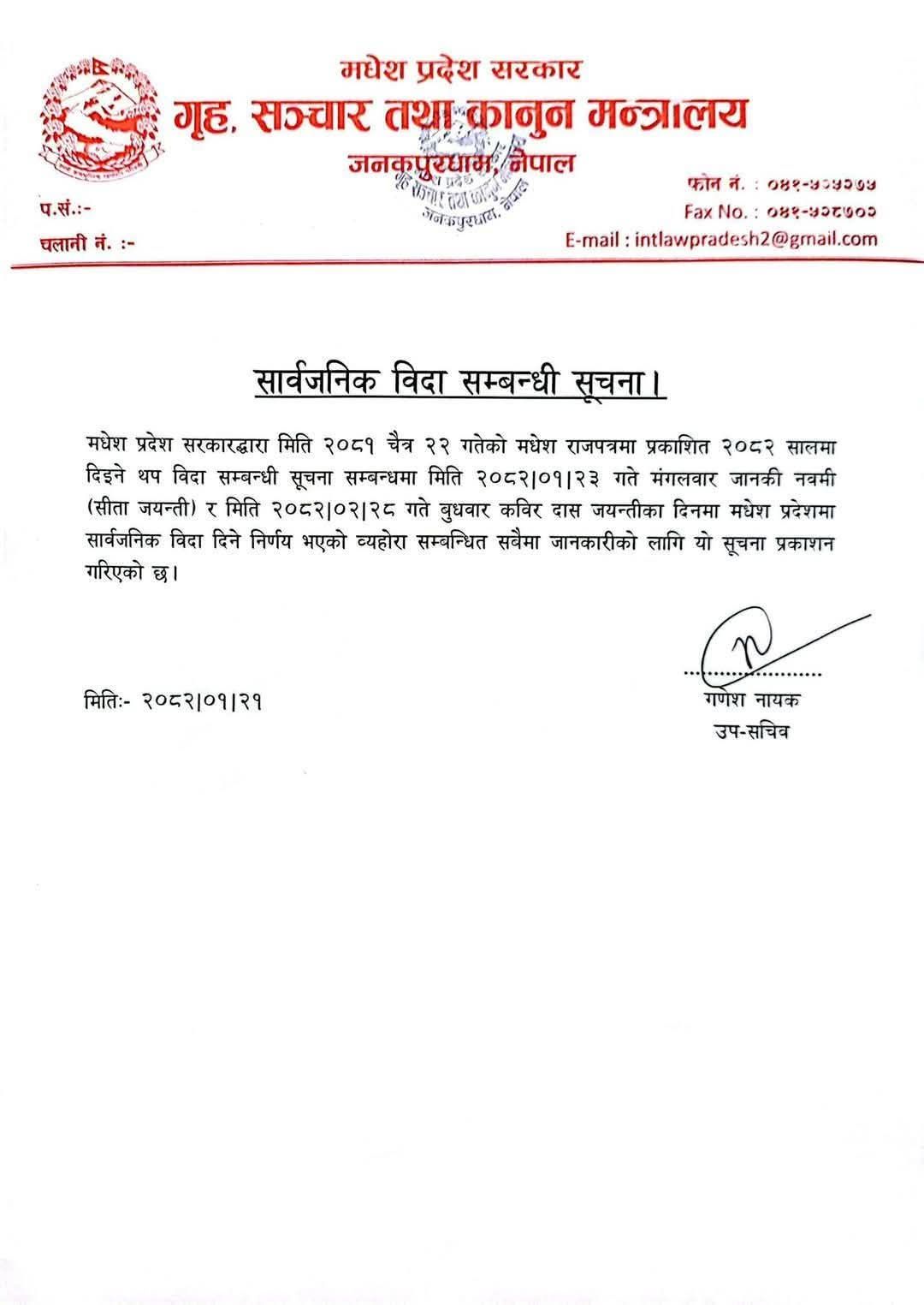 मधेस प्रदेशको गृह, सञ्चार तथा कानून मन्त्रालयले आइतबार एक सूचना जारी गर्दै मंगलबार प्रदेशभर सार्वजनिक विदा दिने जनाएको हो ।