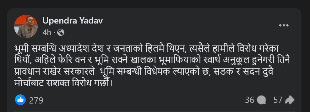 अध्यक्ष यादवले भूमि सम्बन्धी अध्यादेश जनताको हितमा नरहेको भन्दै विगतमा पनि पार्टीले विरोध गरेको स्मरण गरे ।