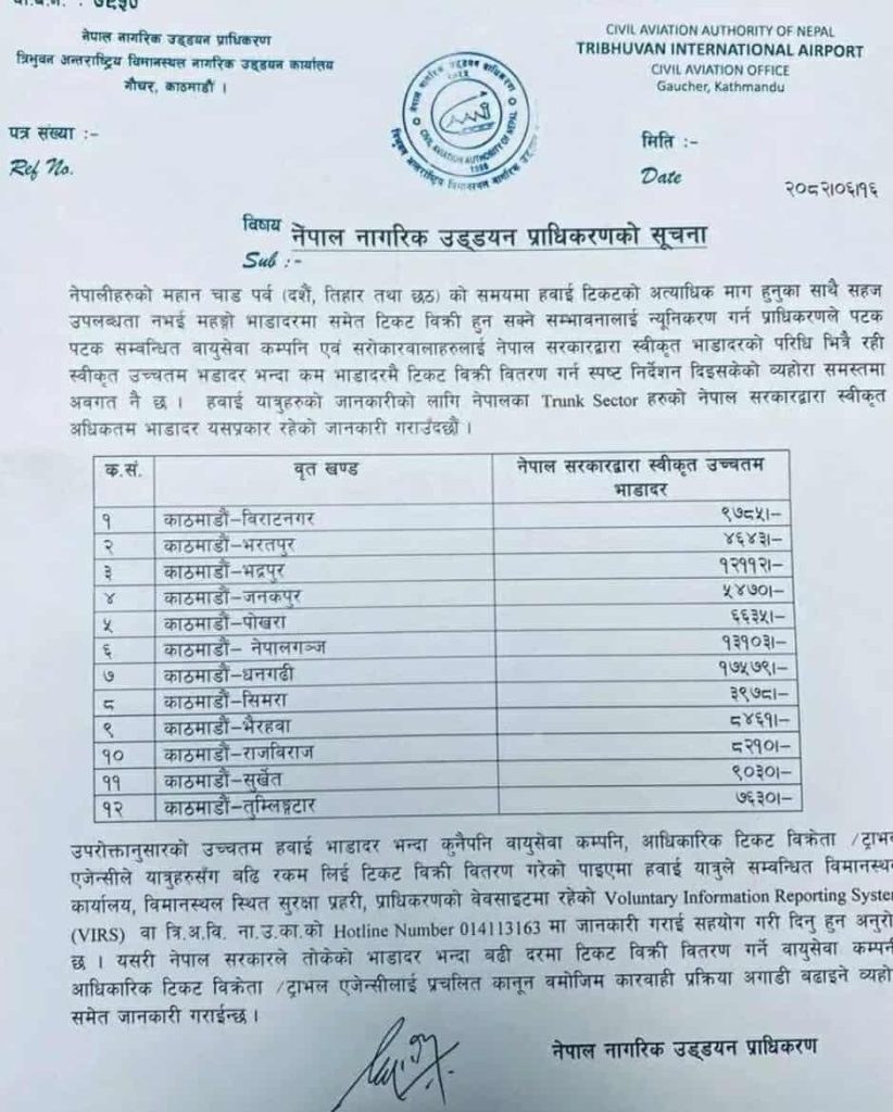 नेपाल नागरिक उड्डयन प्राधिकरणले चाडबाडको समयमा हवाई भाडा महँगो हुने अवस्थालाई मध्यनजर गर्दै नयाँ भाडादर तोकेको छ ।