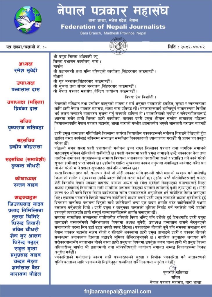 नेपाल पत्रकार महासंघ, बारा शाखाले जिल्ला प्रहरी कार्यालय बाराका प्रमुख एसपी सन्तोष तामाङका पछिल्ला क्रियाकलापप्रति गम्भीर ध्यानाकर्षण भएको जनाएको छ।