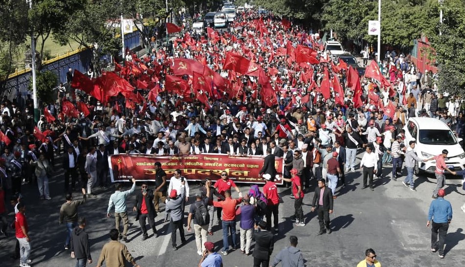 सर्वपक्षीय अन्तरिम सरकारको माग गर्दै नेकपाले र्यालीसहित शान्ति बाटिकाबाट भृकुटीमण्डपसम्म प्रदर्शन गरेको हो।