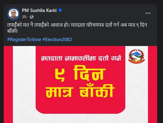 प्रधानमन्त्री सुशीला कार्कीले मतदाता नामावलीमा नाम दर्ता गराउन सबैलाई अपिल गरेकी छिन्। नाम दर्ता गर्ने समय नौ दिन मात्र बाँकी रहेको भन्दै उनले यस्तो आह्वान गरेकी हुन्।