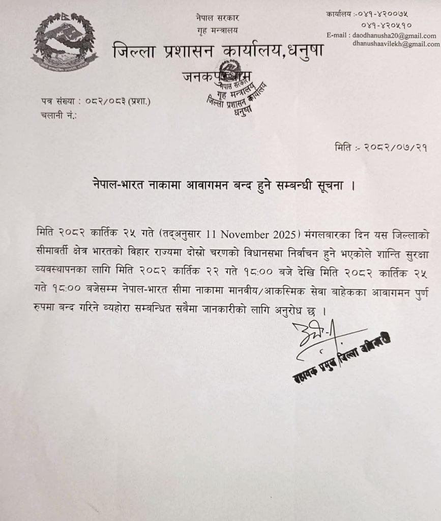 धनुषा जिल्ला प्रशासन कार्यालयले आगामी मङ्गलबार भारतको बिहार राज्यमा हुने दोस्रो चरणको विधान सभा निर्वाचनलाई दृष्टिगत गर्दै जिल्लाका नेपाल–भारत सीमावर्ती नाकामा आवागमन तीन दिनका लागि बन्द हुने जानकारी दिएको छ।