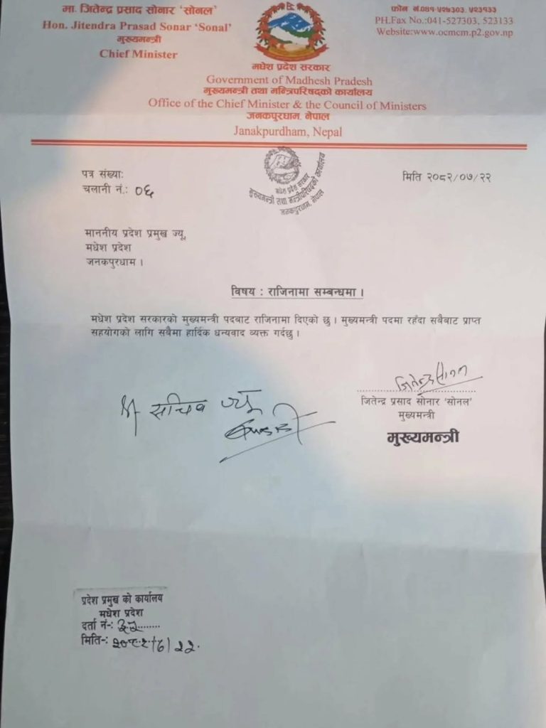 मधेश प्रदेशको इतिहासमै पहिलो पटक मुख्यमन्त्रीले विश्वासको मत लिनमा असफल भएका छन् । मुख्यमन्त्री जितेन्द्रप्रसाद सोनलले विश्वासको मत पाउन नसक्ने राजनीतिक परिदृश्य देखेपछि अन्ततः राजीनामा दिएका छन् ।